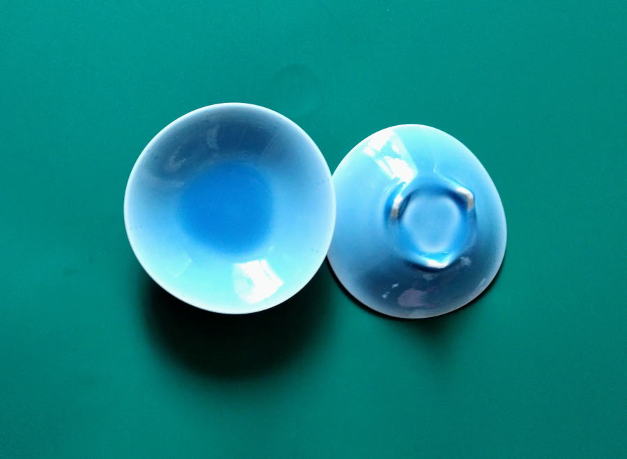 2024年12月5日〈白化粧のカップとトルコブルーの小鉢〉小鉢はシルクロードをイメージして作りました。金の縁は道です。近々お嫁に行きます。