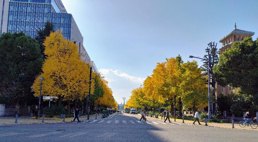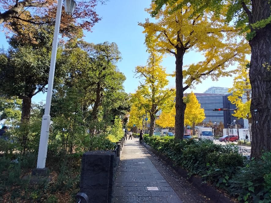 (8)横浜散歩:日本大通りの銀杏並木。前方に横浜スタジアムが見えます。山下臨港プロムナードより撮影
