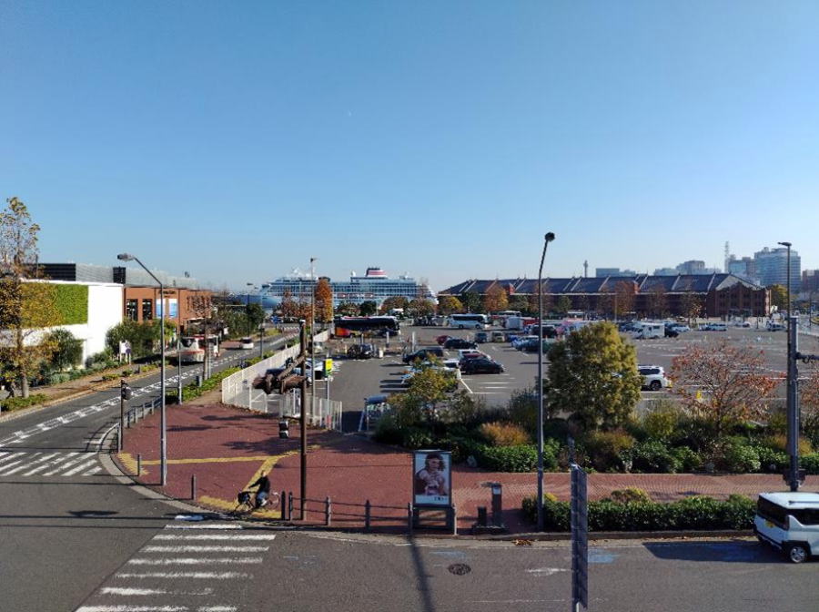 (15)横浜散歩:赤レンガ倉庫と飛鳥Ⅲ。新港サークルウォークより撮影