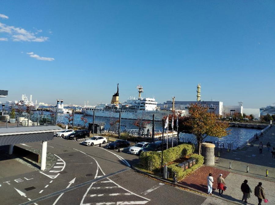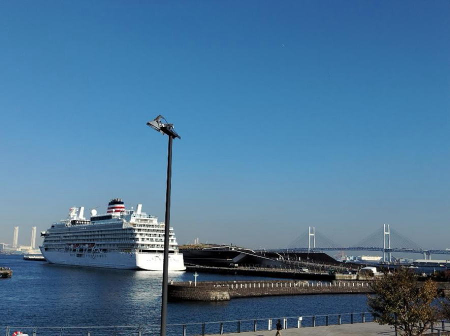 (1)横浜散歩:11月28日気温20度。飛鳥Ⅲが大さん橋に入港。今年7月に就航したので私は初めての出会いです。大さん橋にて。
