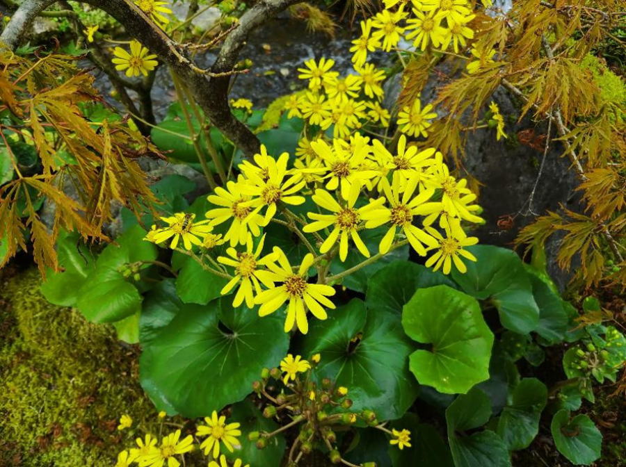 〈つわぶき文変型菓子皿〉 径25cm 彫りはきめ彫り一部浮き彫り、塗りは濃い緑、花に黄色と金 が入ってます。