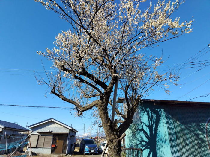 いち早く咲いた古木の梅、後ろに富士山が小さく見えます。空がきれい